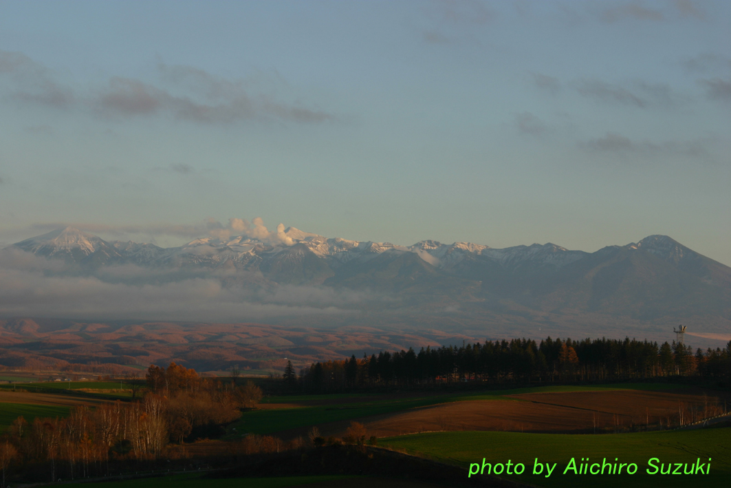 夕暮れ間近の丘と、うっすらと雪化粧した十勝岳連峰と。こうして眺めてみると、たくさんの丘が連なっているいるのがわかります。