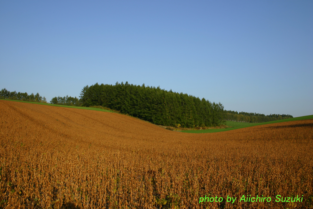 収穫間近の豆畑の丘。夕暮れ近くということもあって、丘のうねりが赤く染まっていました。