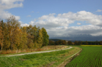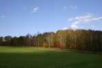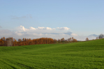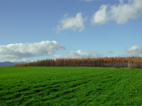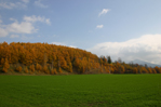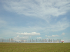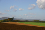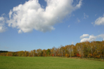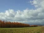 畑の緑と赤く色づいたカラマツ、そして空の青さと雲の白さ。今でもお気に入りの一枚です。