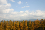 色づいたカラマツ林の向こうには十勝岳連峰が雲間から少し顔をのぞかせています。