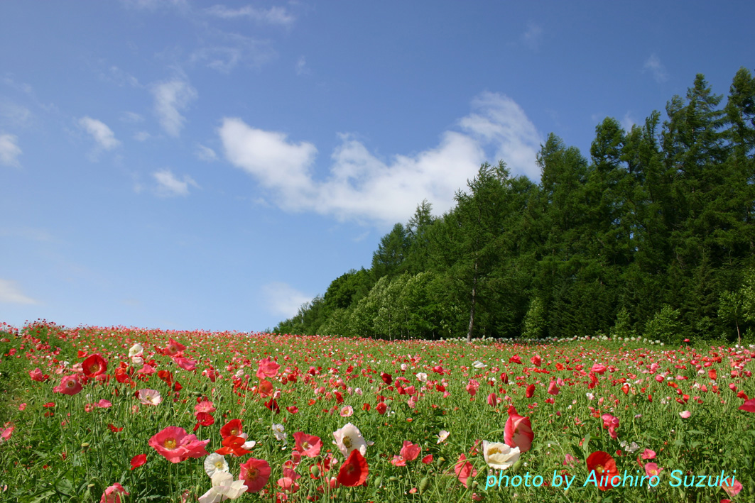 満開のポピー畑。風がやむ一瞬を待って撮りました。