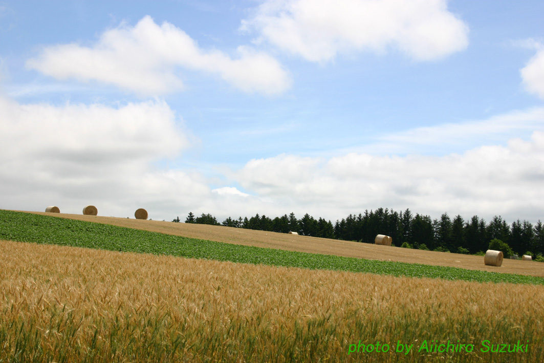 手前は刈り入れ前の麦畑、奥は刈り入れ後の麦畑。