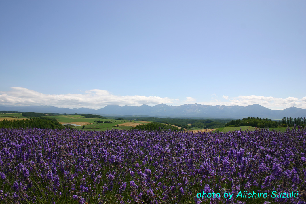 ラベンダー畑の向こうに広がる十勝岳連峰。