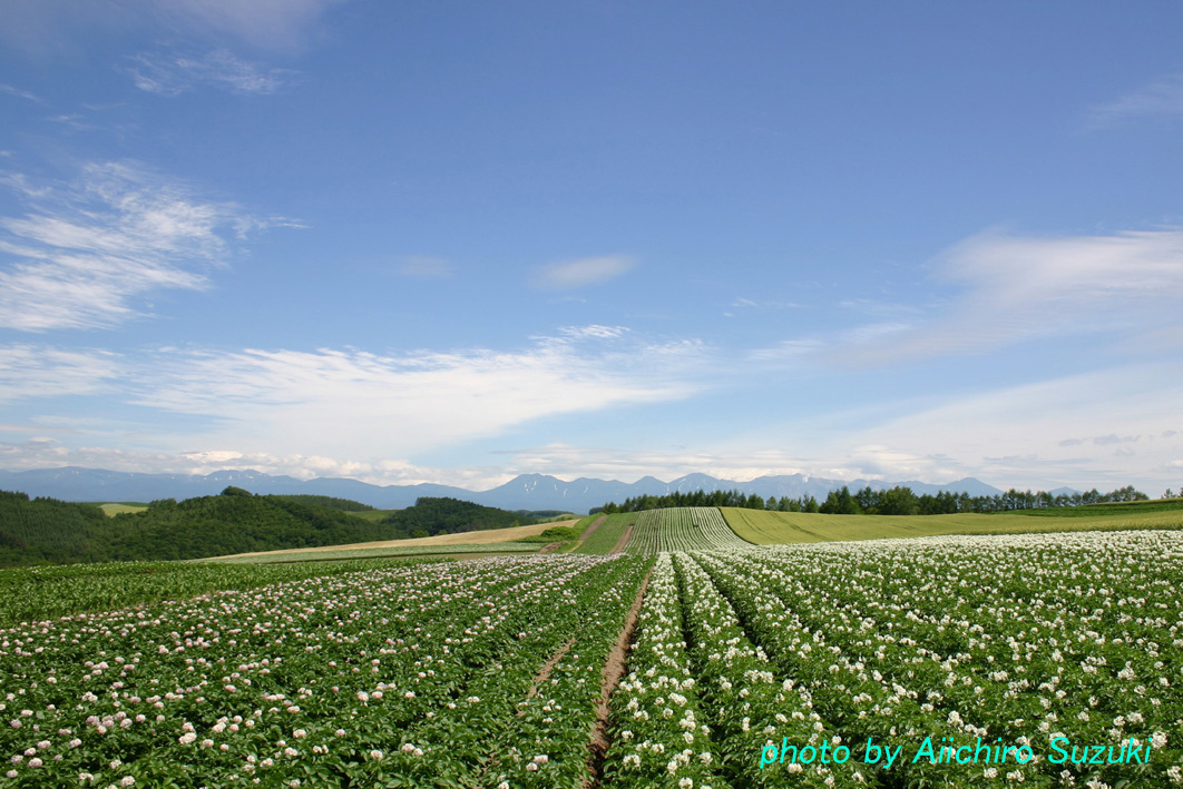 十勝岳連峰を遠望して、右が白、左が薄ピンクのジャガイモの花です。