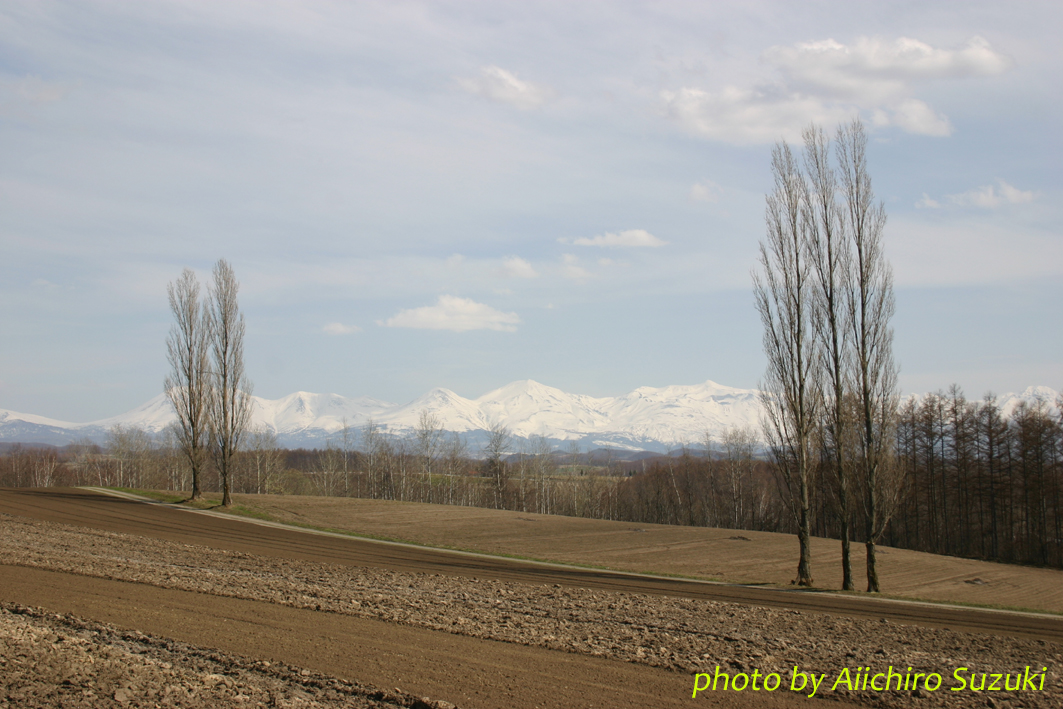 きれいに耕された大地の向こうには白い山並み。