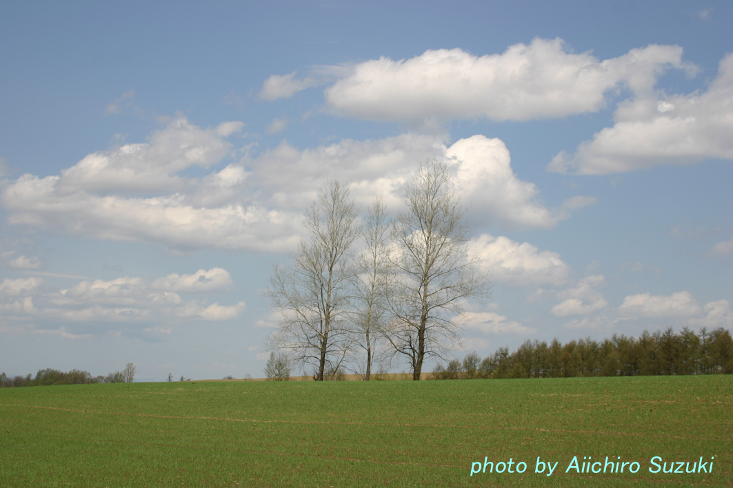 のどかな春の日差しの下、寄り添い合う3本の木。