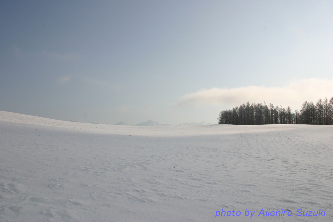 丘に日なたと日陰のコントラストができて、遠くには十勝岳連峰がうっすらと。