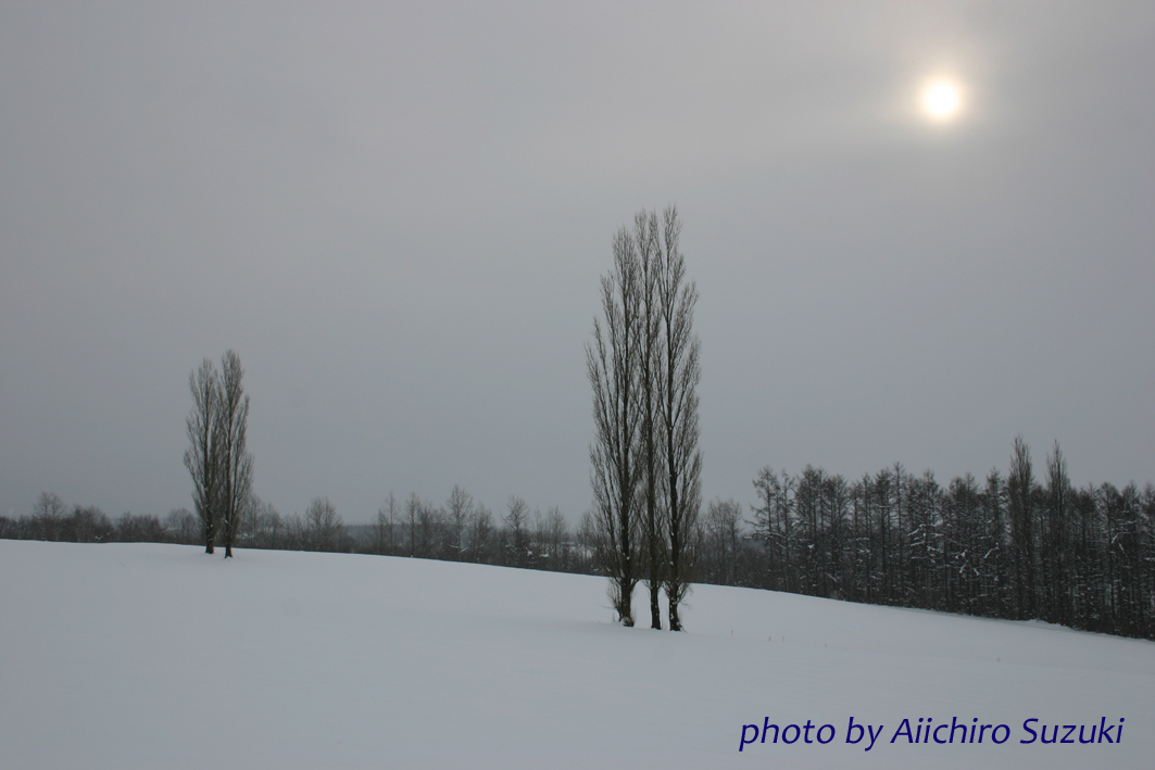 雪雲の切れ間から太陽がうっすらと見えて、月のような淡い光で丘を照らしていました。