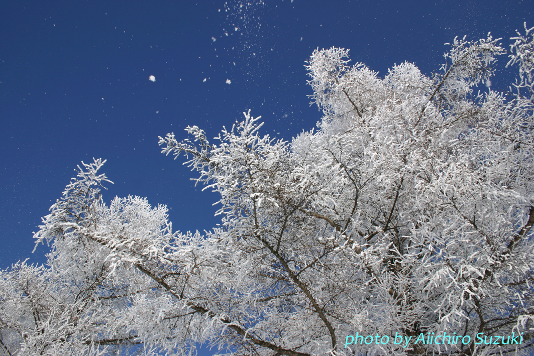 強い風が吹くと、霧氷がはらはらと舞い落ちてきます。